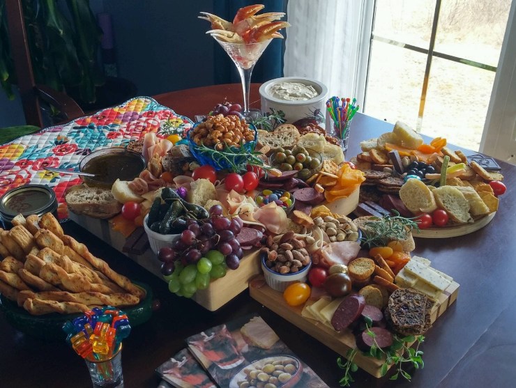 The big charcuterie display shown here on my dining room table. was something I put together last summer. My husbands family was visiting from Nova Scotia, so I decided to have the whole family over. Young, old Aunties and Uncles & Friends It was a great time. Although this looks spectacular; It really wasn’t that difficult to put together. It was so pretty we had a hard time convincing people to eat it. Once they started there was no stopping them.