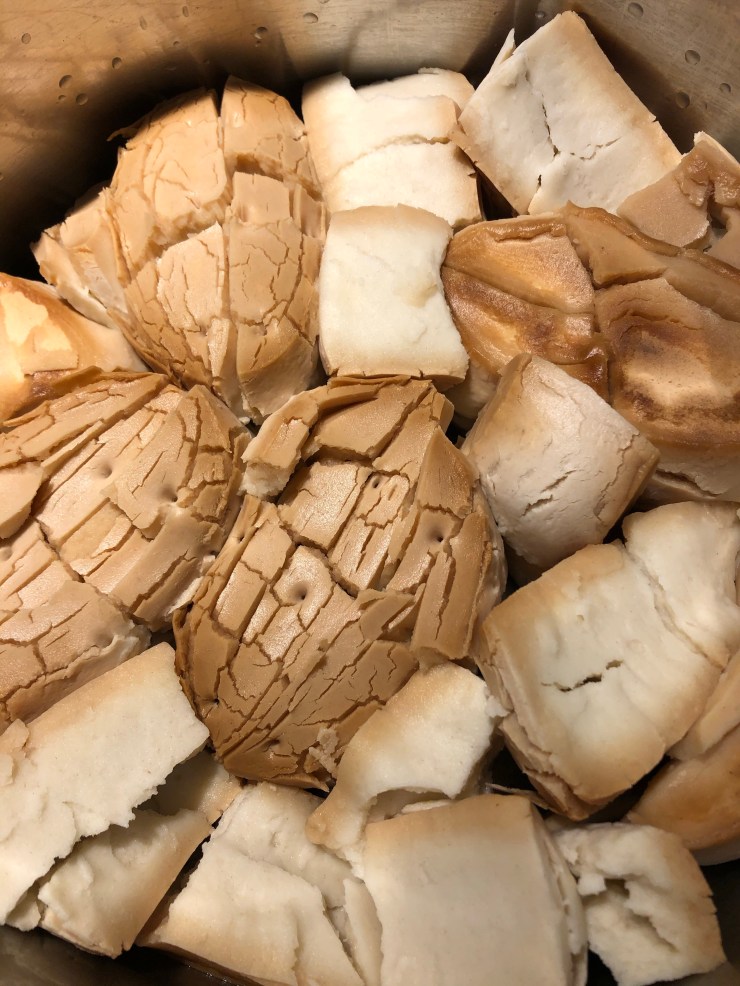 The night before you are planning to prepare the fish and brewis. Cut your fish in large pieces and add enough cold water just to cover the top. If you are using fresh fish you can omit this step.